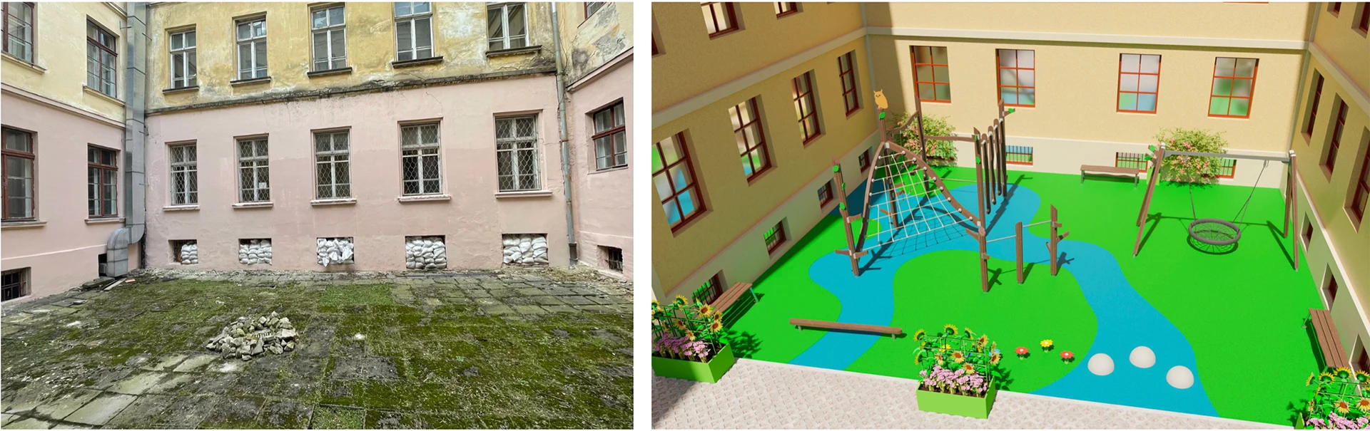 Ensimmäinen leikkikenttä rakentuu Lvivin julkisen koulun nro 62 oppilaille. Koulun sisäpihalle rakennetaan alue, jolla koulun 6-10-vuotiaat oppilaat voivat leikkiä. Välineiden mahdollistama liikunta, kuten esimerkiksi kiipeileminen ja riippuminen, toimii luokassa istumisen vastapainona. Rakennustyöt ovat alkaneet, ja tavoitteena on saada kenttä valmiiksi ennen kesää.